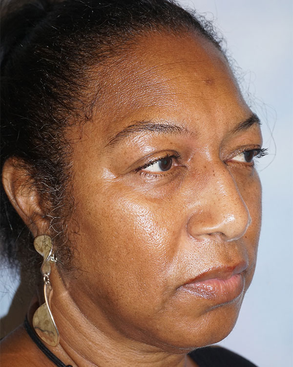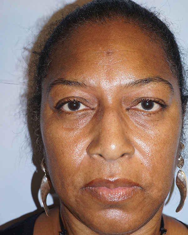 Early post-op result of patient who desired crease formation in upper eyelid along with added structure to bridge and tip of nose. Nostrils which have been brought down, can be appreciated on frontal and three-quarter view.