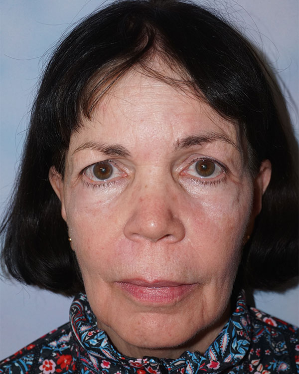 Two month post-op frontal view of brow lift and upper lid blepharoplasty. Note correction of frown lines and forehead wrinkles. Eyebrows placed in a higher but natural position. Excessive skin also corrected from upper lids. Her eyelid hooding was such that her vision was significantly affected and allowed for insurance reimbursement. All scars are virtually undetectable and hidden in either the hairline or eyelid crease.