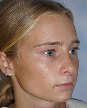 Young lady that is only 3 weeks post op who underwent a reconstructive rhinoplasty and septoplasty. Had trauma to her nose as a child that resulted in a twisted tip and widened/crooked dorsum and blocked airway from a severely deviated septum. On profile the pre op picture demonstrates an over projected tip that needed refinement and reduction closer to her face. Multiple cartilaginous grafts were used.