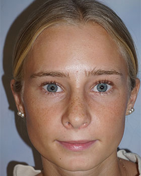 Six weeks post op of septorhinoplasty and partial inferior turbinectomy. Bony and cartilaginous dorsal reduction and refinement. Patient declined any tip narrowing as desired to maintain her natural mildly rounded tip