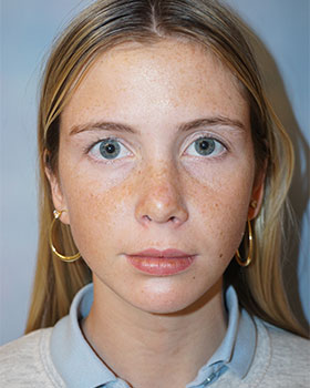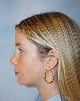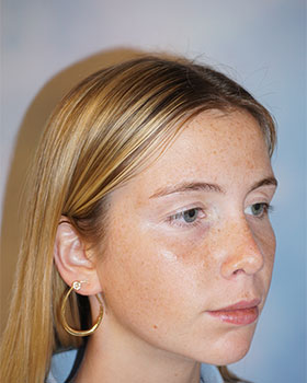 Six weeks post op for this young lady who underwent a septorhinoplasty and inferior turbinectomy. Hump removal and straightening of a curved dorum to give a more natural and softer look