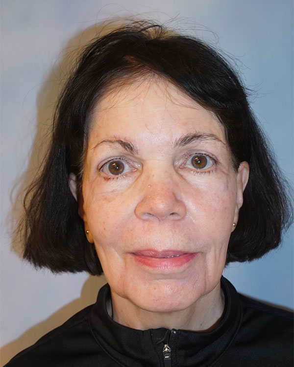 Two month post-op frontal view of brow lift and upper lid blepharoplasty. Note correction of frown lines and forehead wrinkles. Eyebrows placed in a higher but natural position. Excessive skin also corrected from upper lids. Her eyelid hooding was such that her vision was significantly affected and allowed for insurance reimbursement. All scars are virtually undetectable and hidden in either the hairline or eyelid crease.